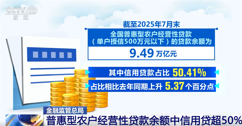 金融监管总局数据显示,截至2025年7月末,全国普惠型农户经营性贷款也就是单户授信500万元以下的农户贷款余额为9.49万亿元,其中信用贷款占比50.41%,占比相比去年同期上升5.37个百分点。