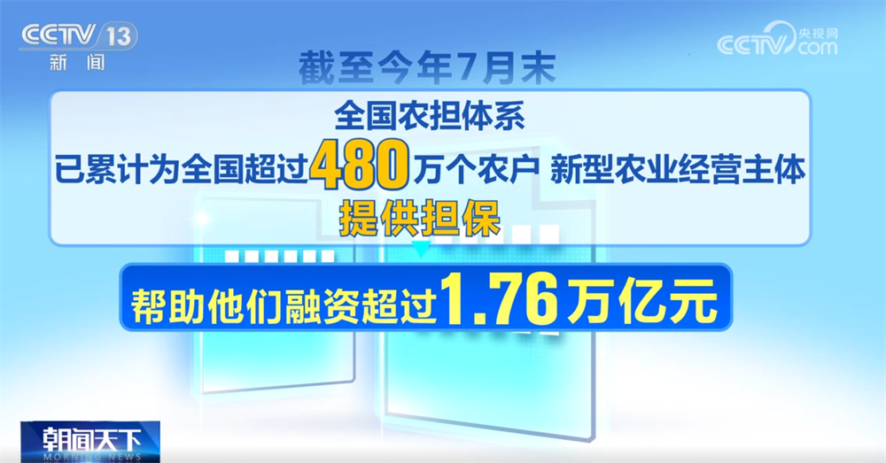 截至今年7月末,全国农担体系已累计为全国超过480万个农户、新型农业经营主体提供担保,帮助他们融资超过1.76万亿元,有效引导了金融资源流向农业生产领域,促进农业增效、农民增收。