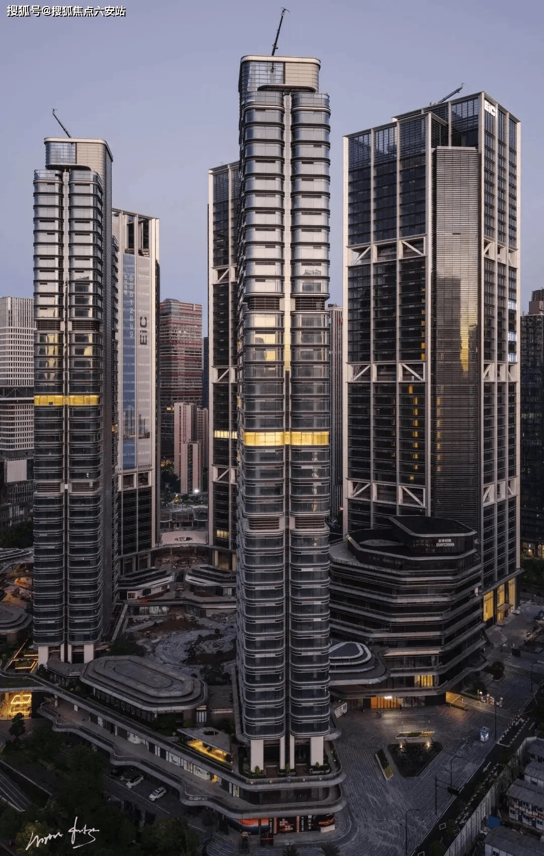 外立面采用2.4米宽曲面玻璃幕墙,每块玻璃重达3吨,通过智能调光膜技术实现光影变幻。